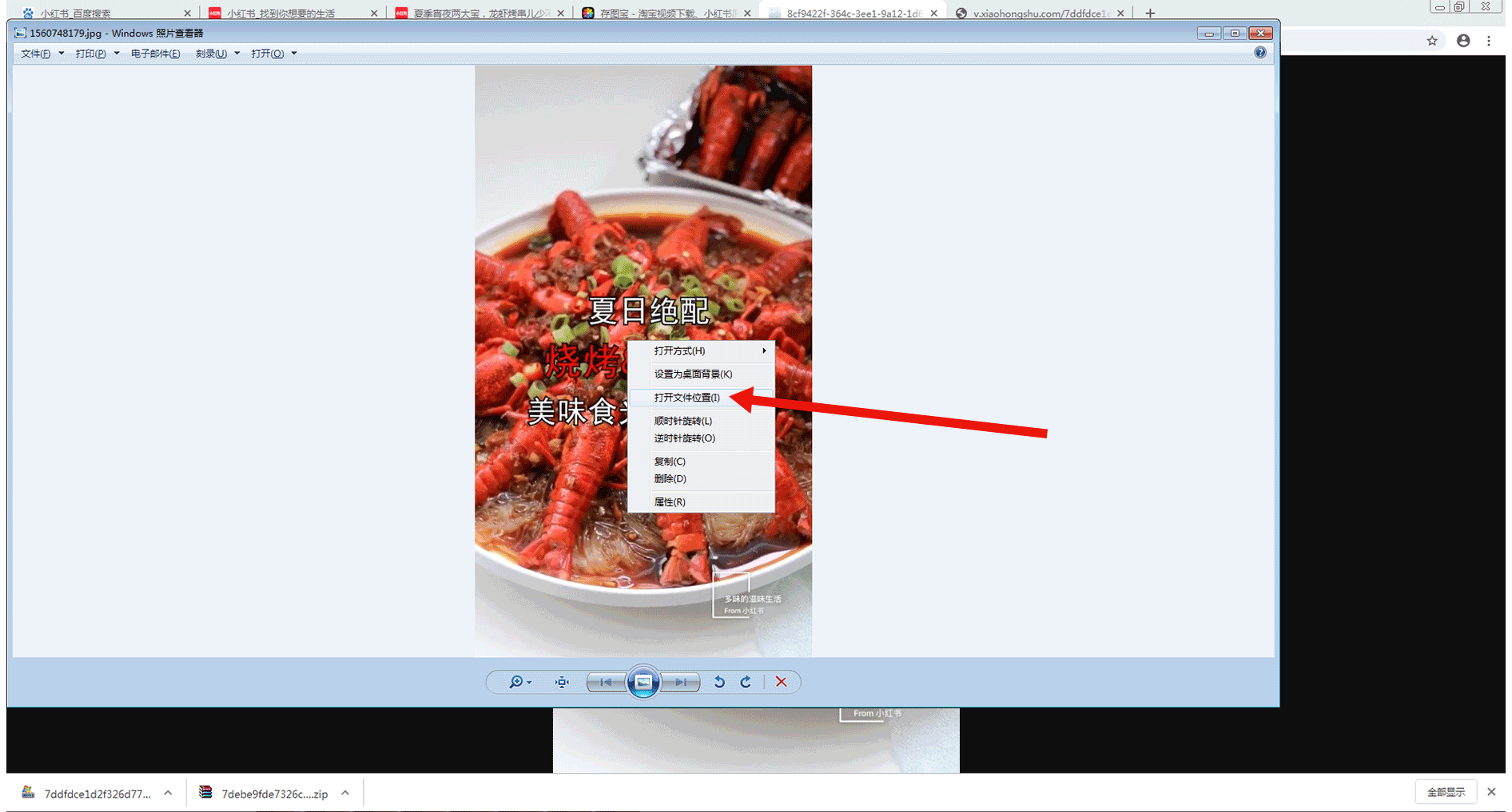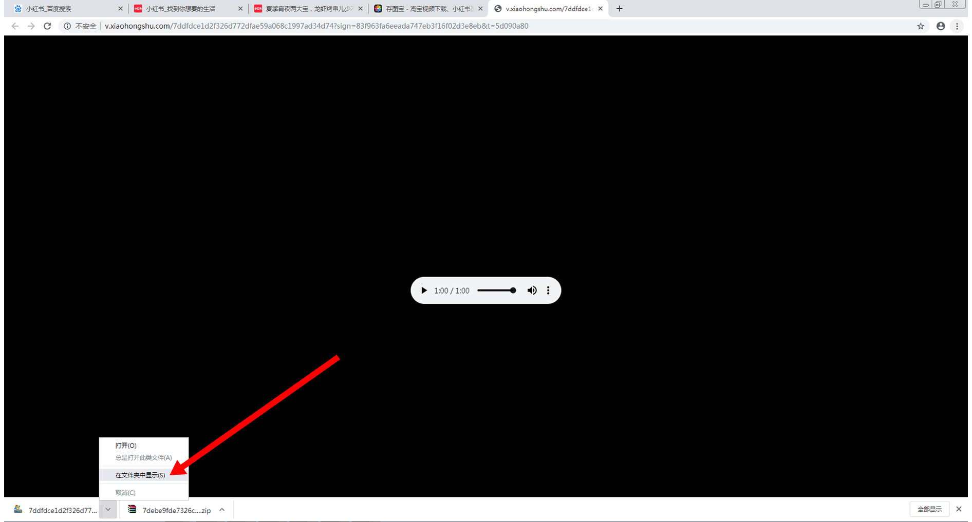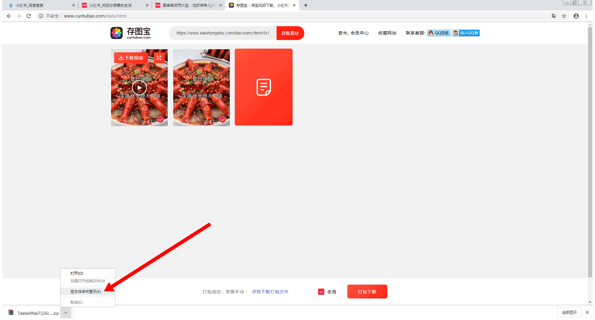 如果无法记住所下载视频和图片的压缩文件的保存路径,可点击左下角压缩文件右侧的箭头,然后再点击“在文件夹中显示(S)”列表,如下图所示: