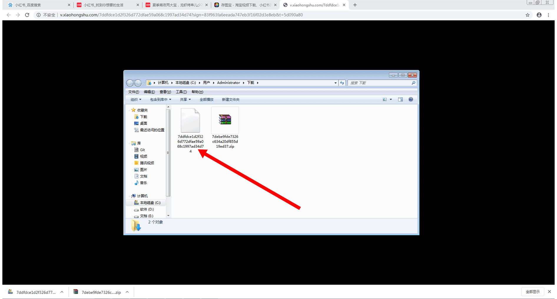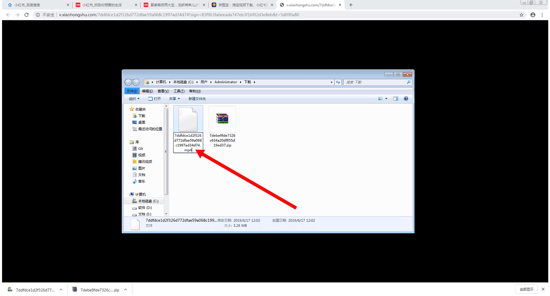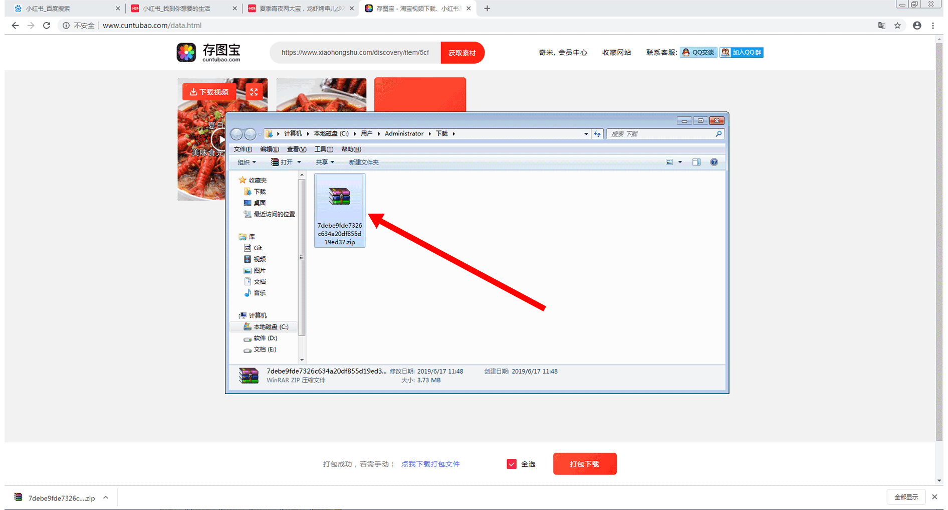 此时将弹出所下载视频和图片的压缩文件所在位置的窗口,可以在该窗口中找到自己刚才下载的所有视频和图片的压缩包,如下图所示: