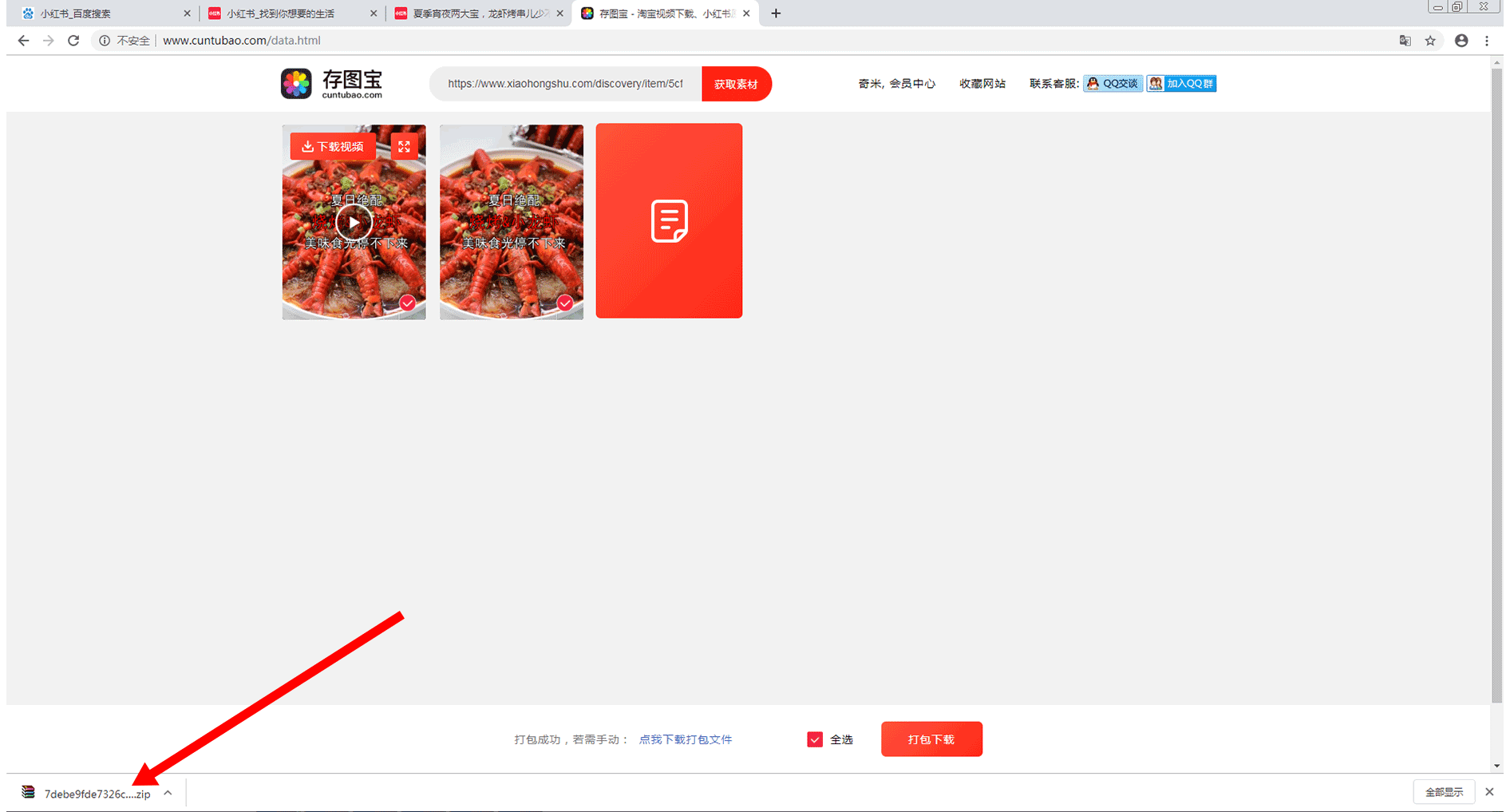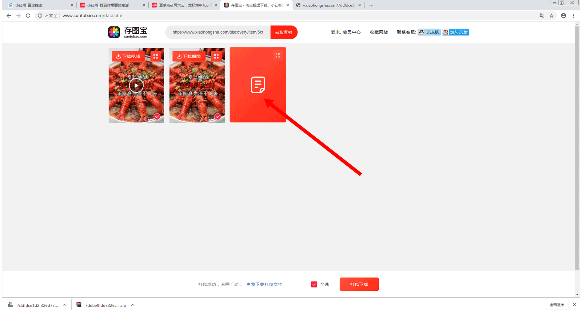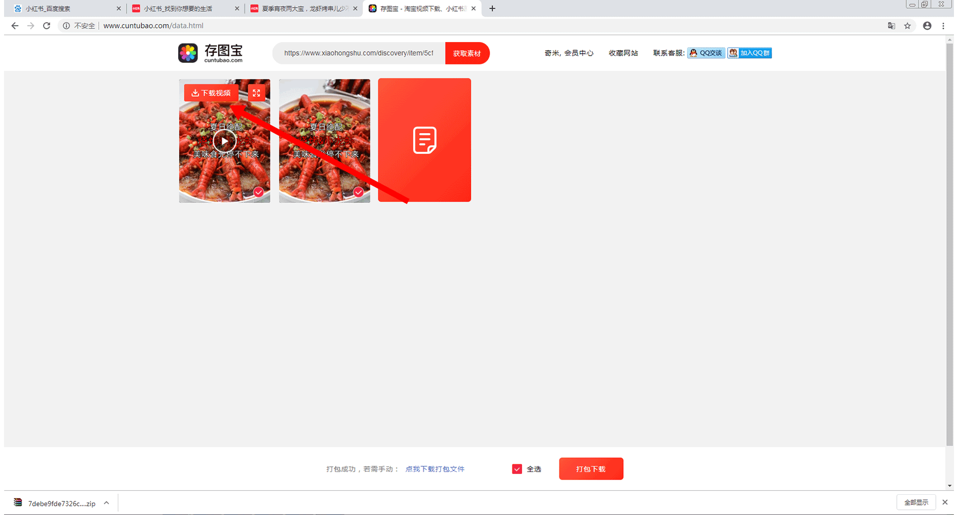 在该页面中,将会显示出该链接中所有能够下载的素材(包括视频、图片和文案)。我们可通过点击“打包下载”按钮,对所需要的素材进行打包下载。