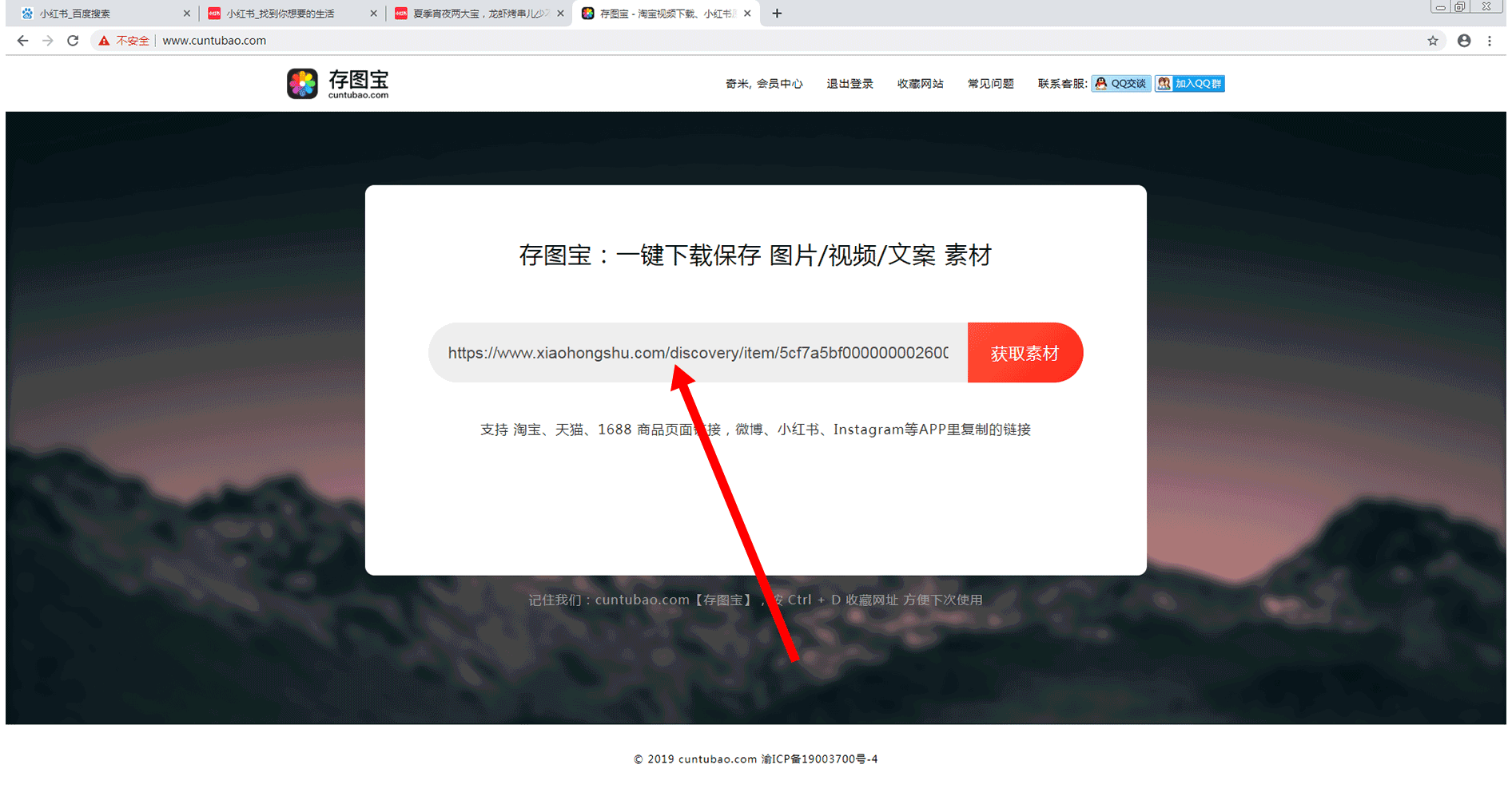 将复制的小红书素材链接粘贴到输入框中,如下图所示: