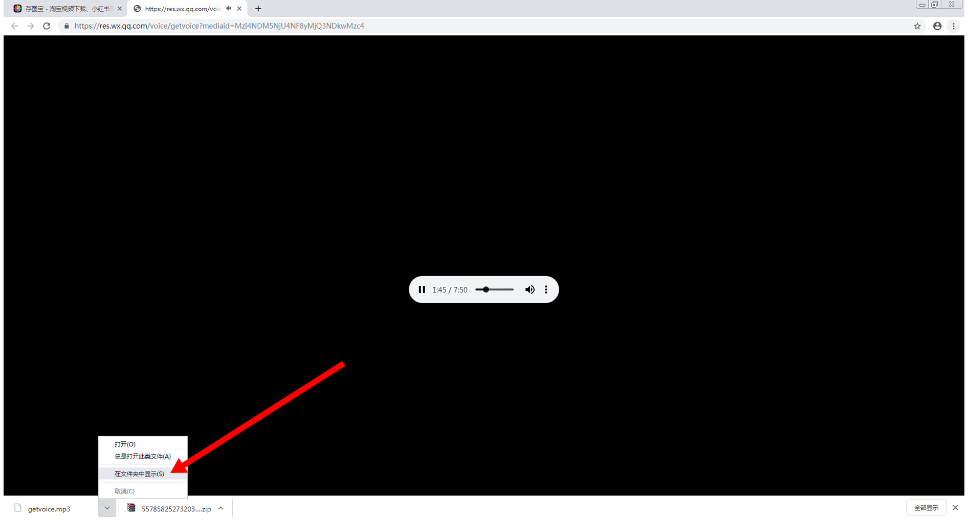 如果无法记住所下载音频的保存路径,可点击左下角音频文件右侧的箭头,然后再点击“在文件夹中显示(S)”列表,如下图所示: