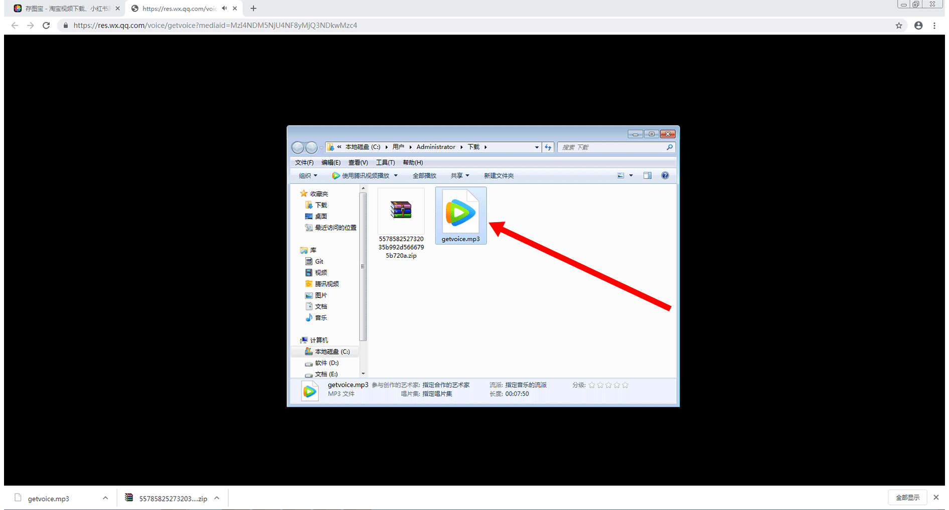 此时将弹出所下音频文件所在位置的窗口,可以在该窗口中找到自己刚才下载的音频文件,如下图所示:
