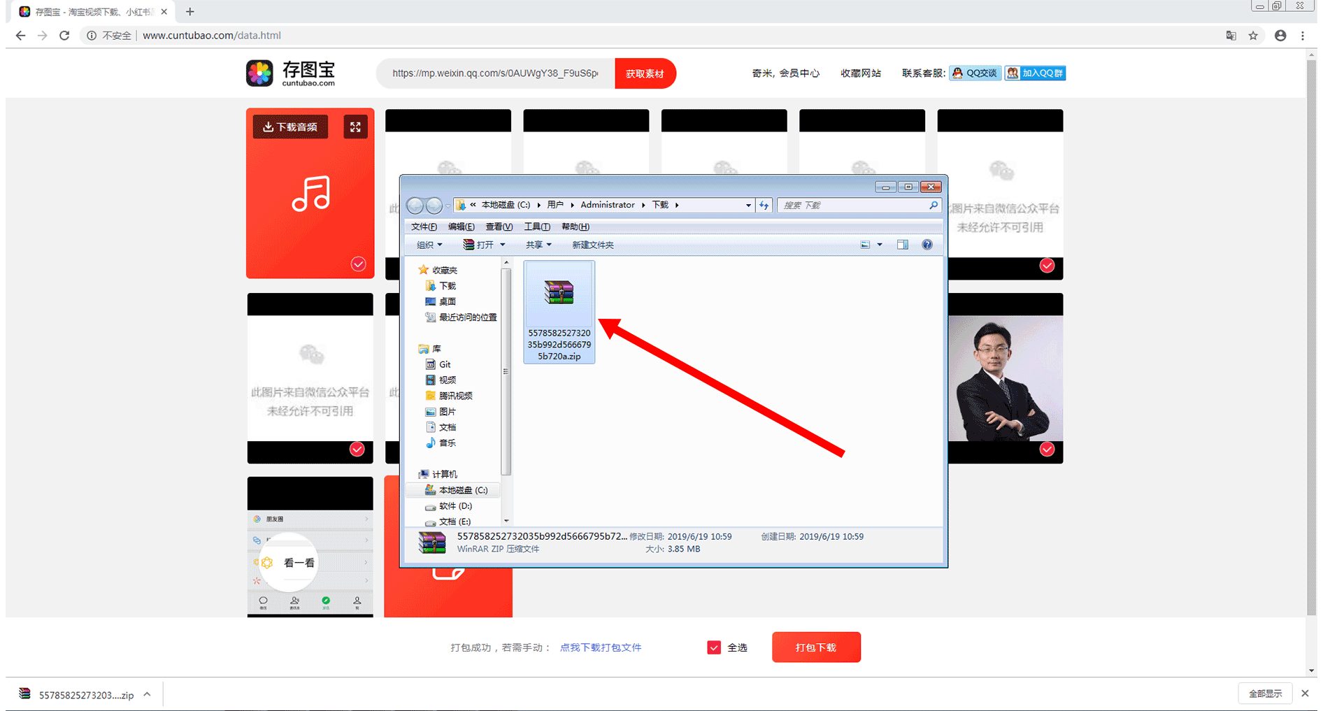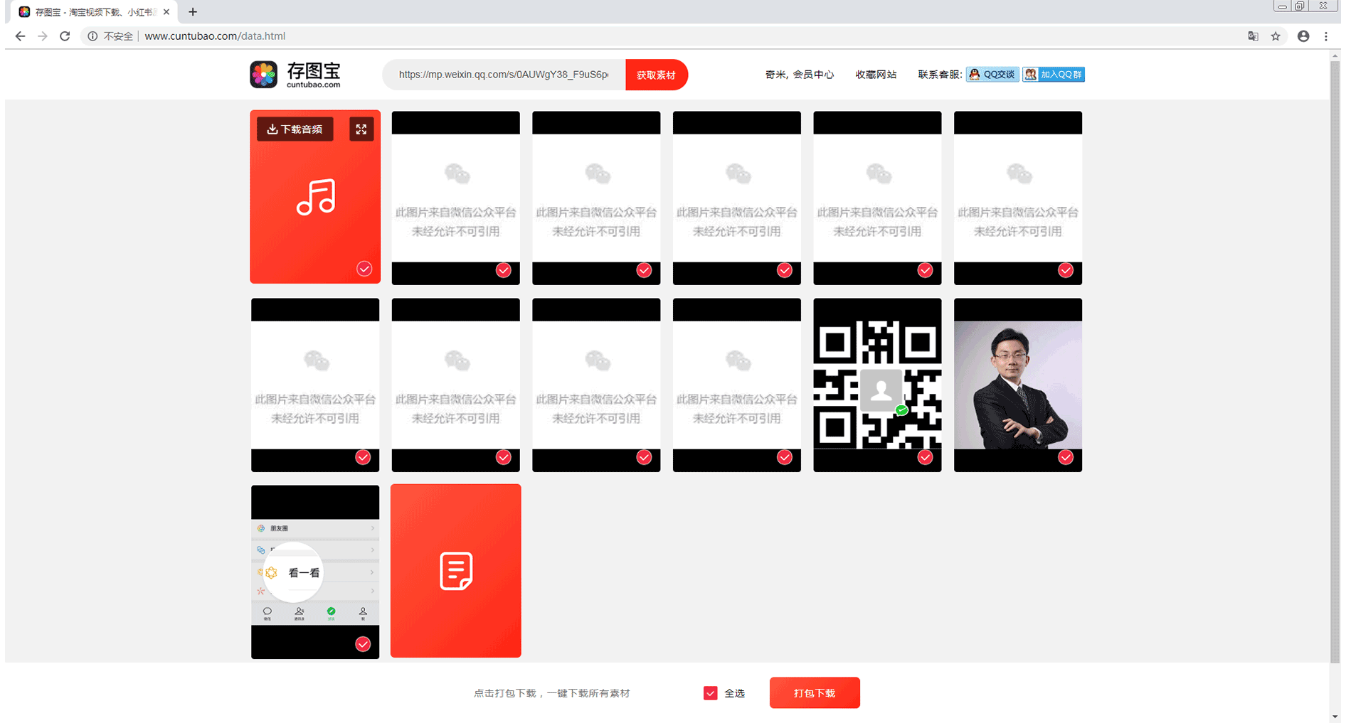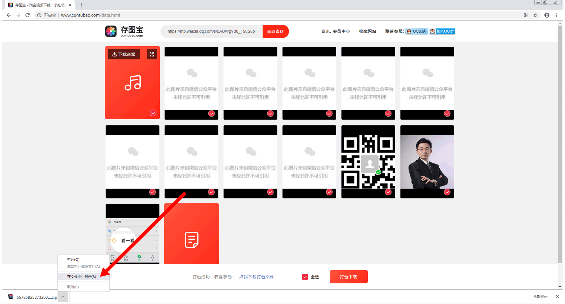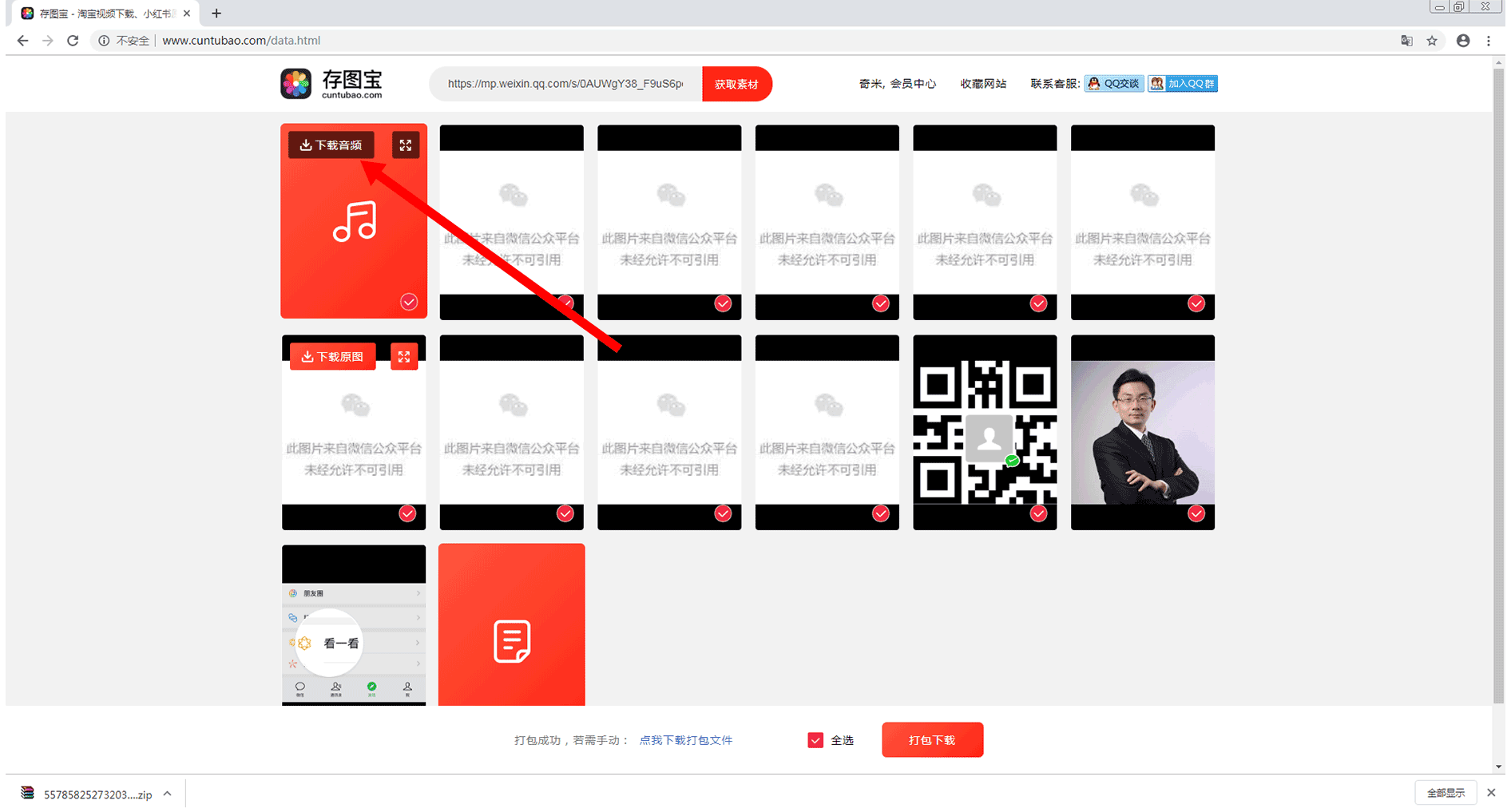 在该页面中,将会显示出该链接中所有能够下载的素材。我们可通过点击“打包下载”按钮,对所需要的素材进行打包下载。