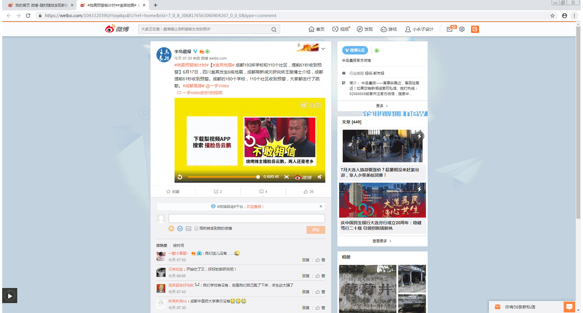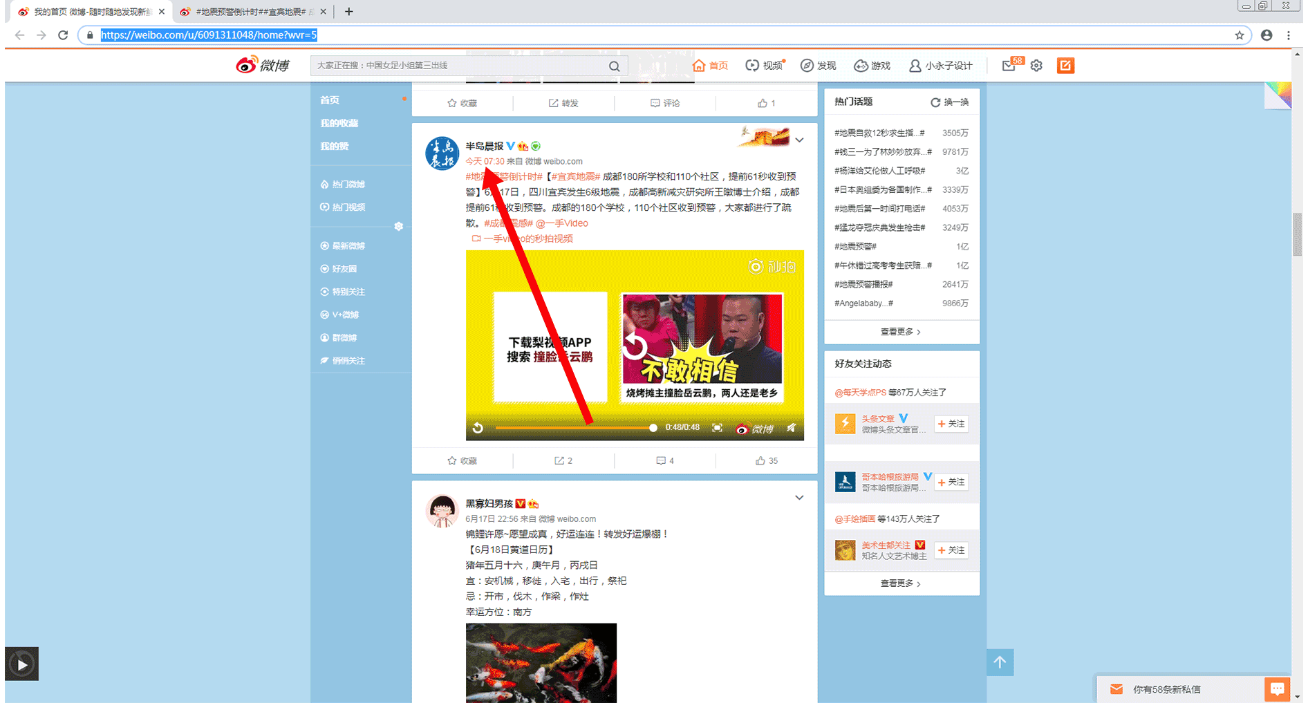 首先,通过浏览器进入到微博首页,然后找到自己需要的视频素材列表,然后点击该列表标题下方的“时间”或“推荐”信息,这里以点击“时间”信息为例,如下图所示: