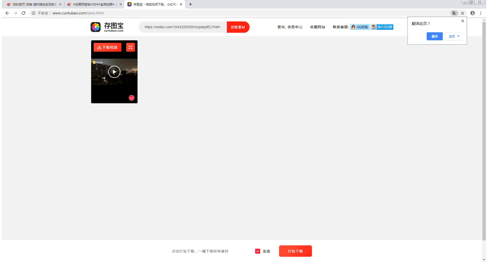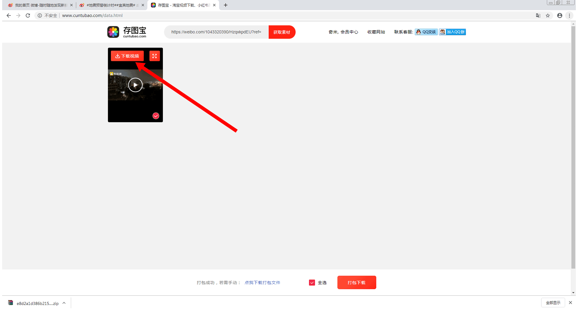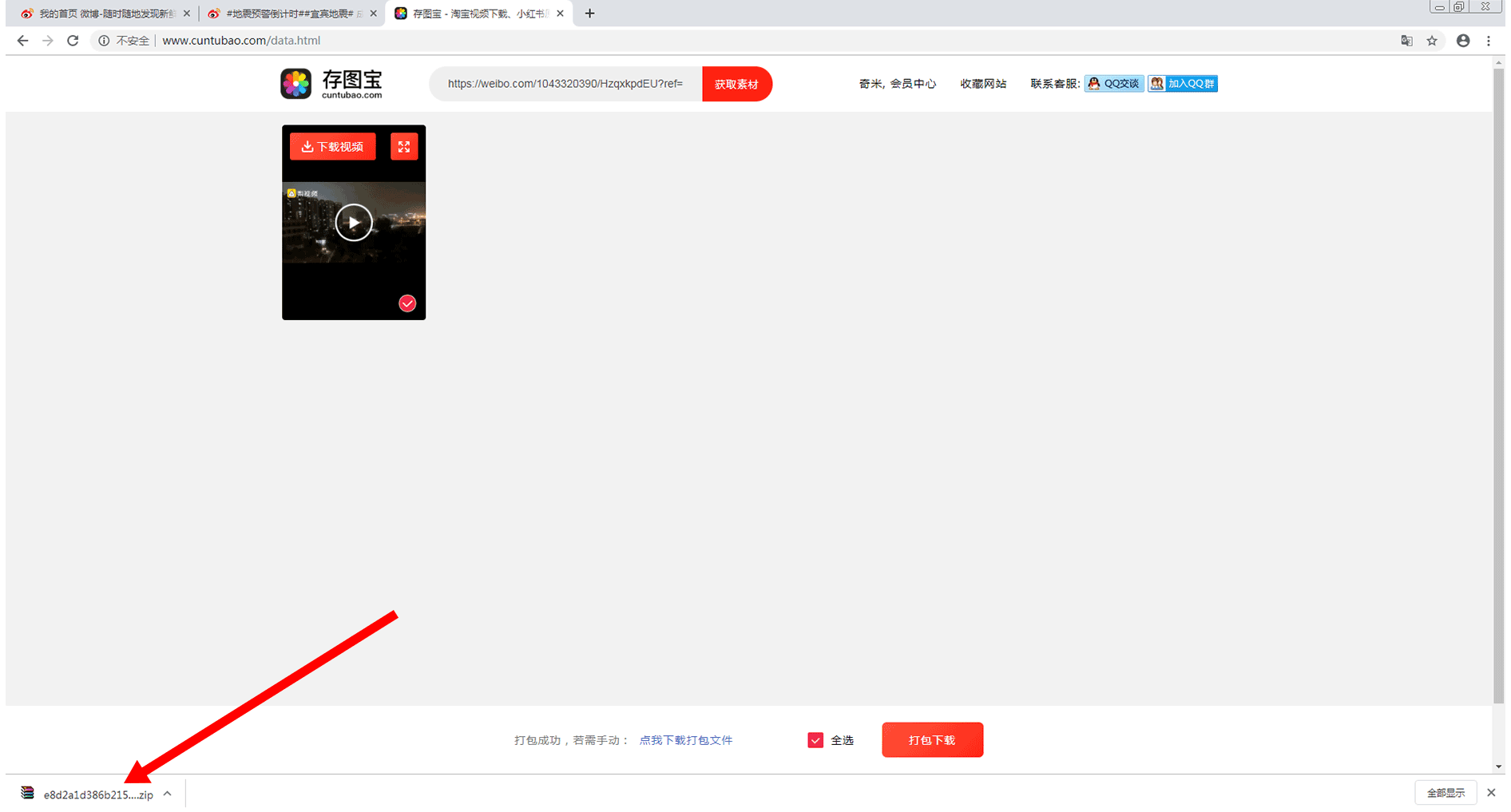 在该页面中,将会显示出该链接中所有能够下载的视频和图片。我们可通过点击“打包下载”按钮,对所需要的视频和图片进行打包下载。