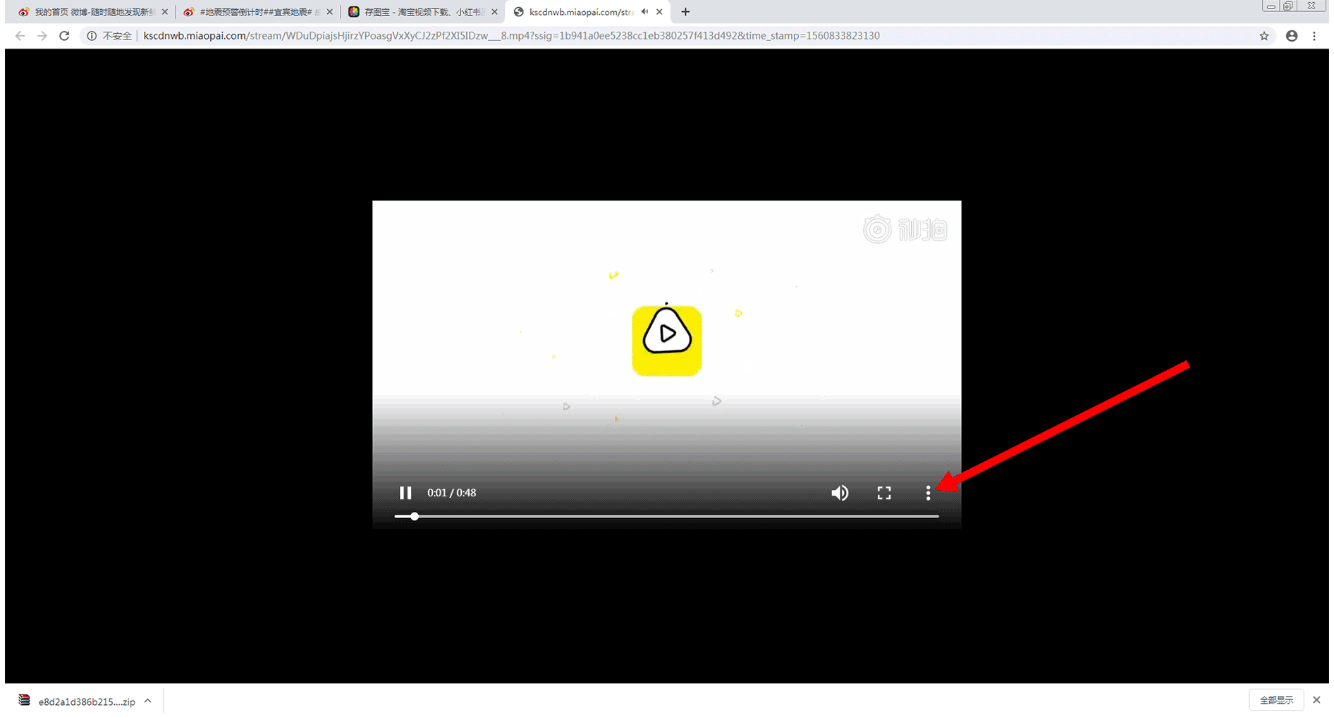 在这里,我们以下载所有视频和图片为例:因进入该页面时,默认所有视频和图片为选中状态(当然,如果我们要下载一个或多个视频或图片,也可以通过勾选/取消对视频或图片进行选择),我们可直接点击“打包下载”按钮进行下载,下载完成后,将会在页面的左下角出现已下载完成的视频和图片的压缩文件,如下图所示: