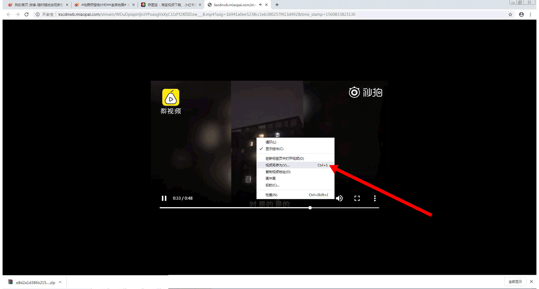 我们也可以在视频上点击鼠标右键,在弹出的菜单中,点击“视频另存为(V)”列表,对视频素材进行保存,如下图所示: