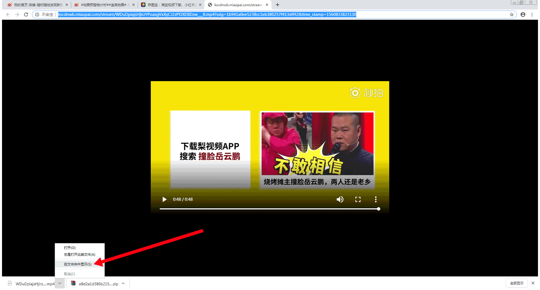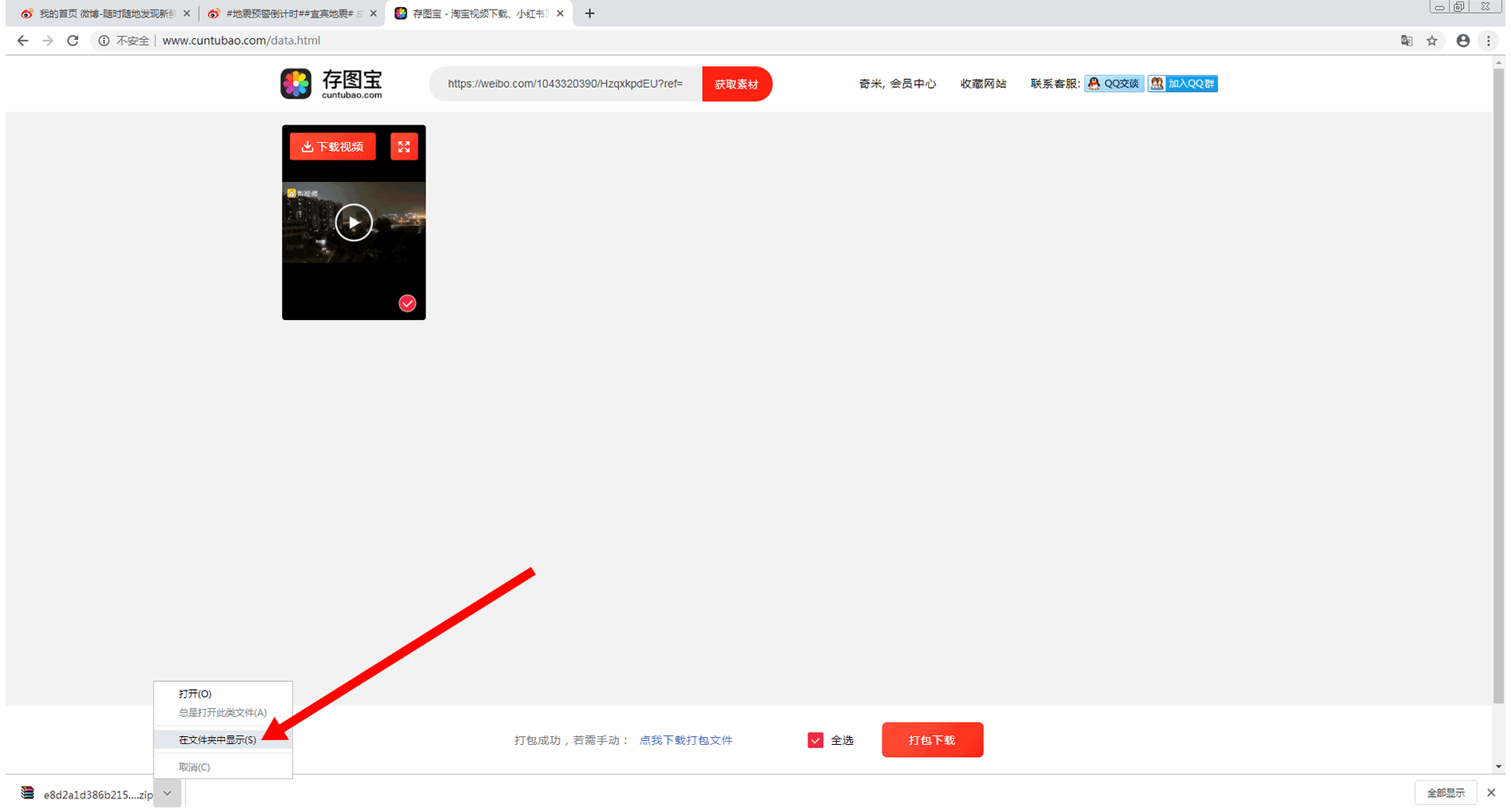 如果无法记住所下载视频和图片的压缩文件的保存路径,可点击左下角压缩文件右侧的箭头,然后再点击“在文件夹中显示(S)”列表,如下图所示: