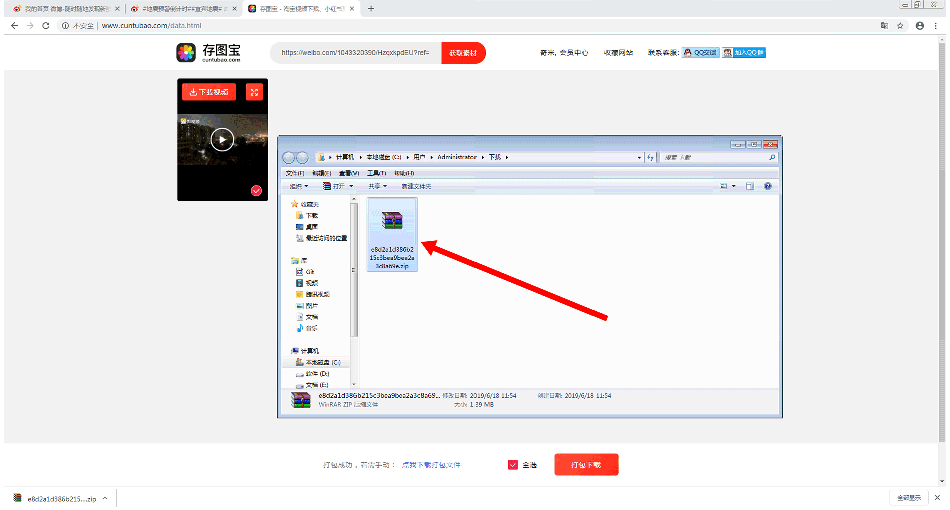 此时将弹出所下载视频和图片的压缩文件所在位置的窗口,可以在该窗口中找到自己刚才下载的所有视频和图片的压缩包,如下图所示: