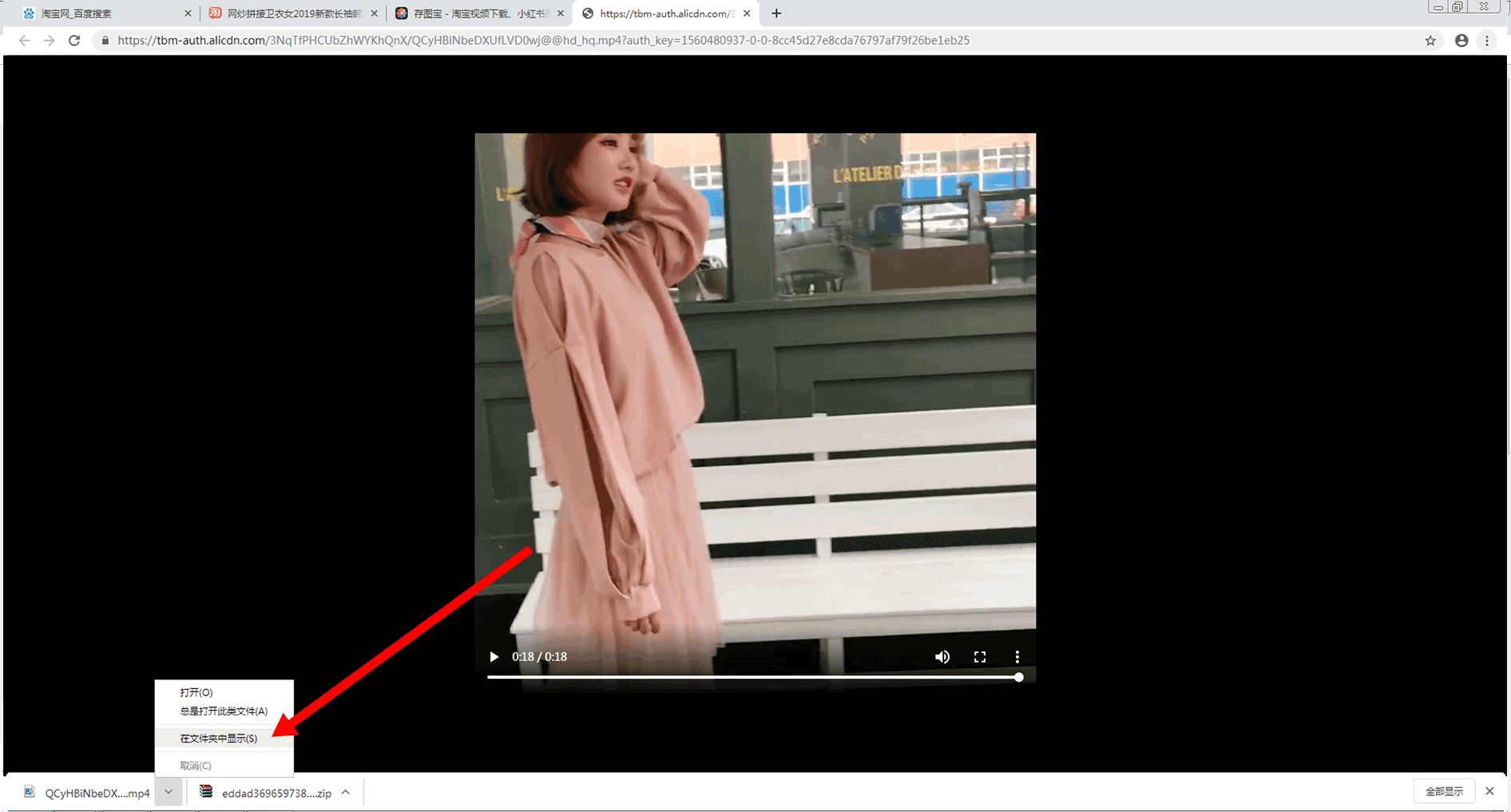 如果无法记住所下载视频和图片的压缩文件的保存路径,可点击左下角压缩文件右侧的箭头,然后再点击“在文件夹中显示(S)”列表,如下图所示: