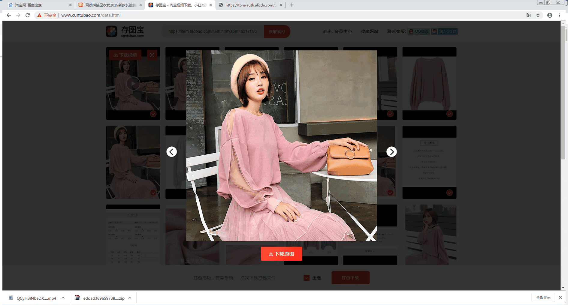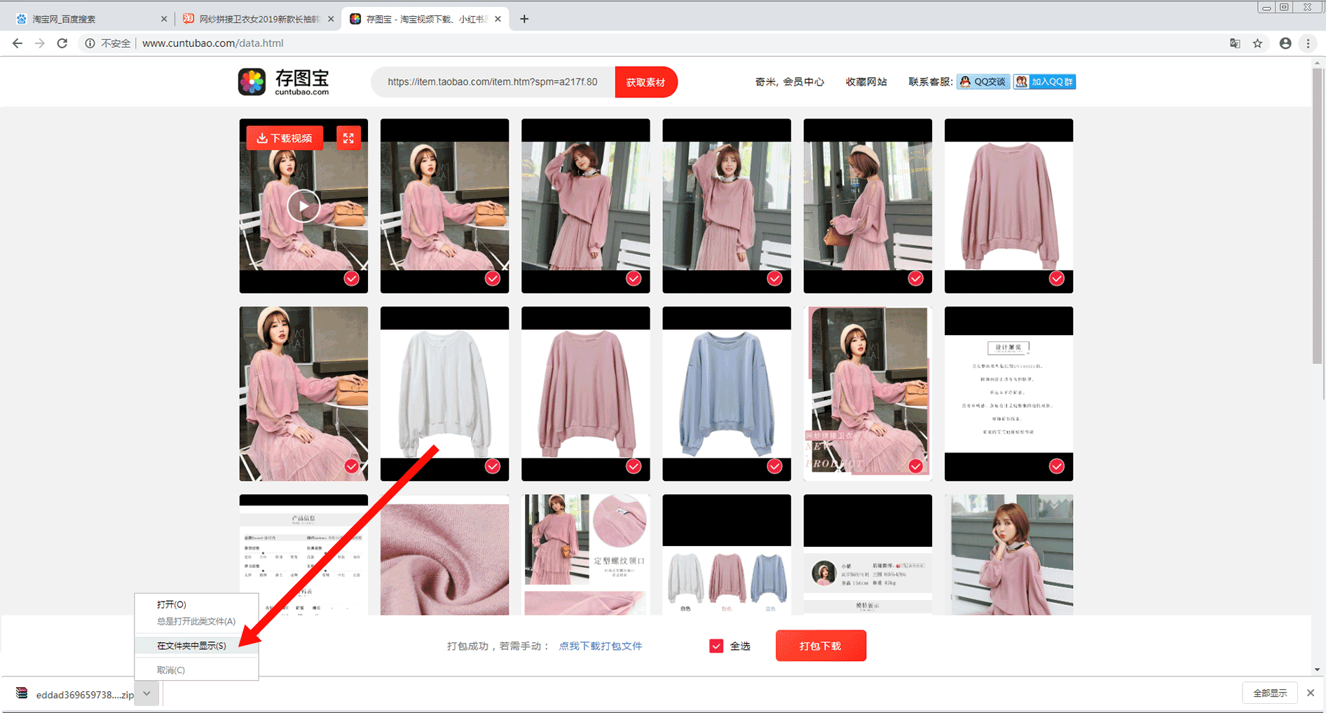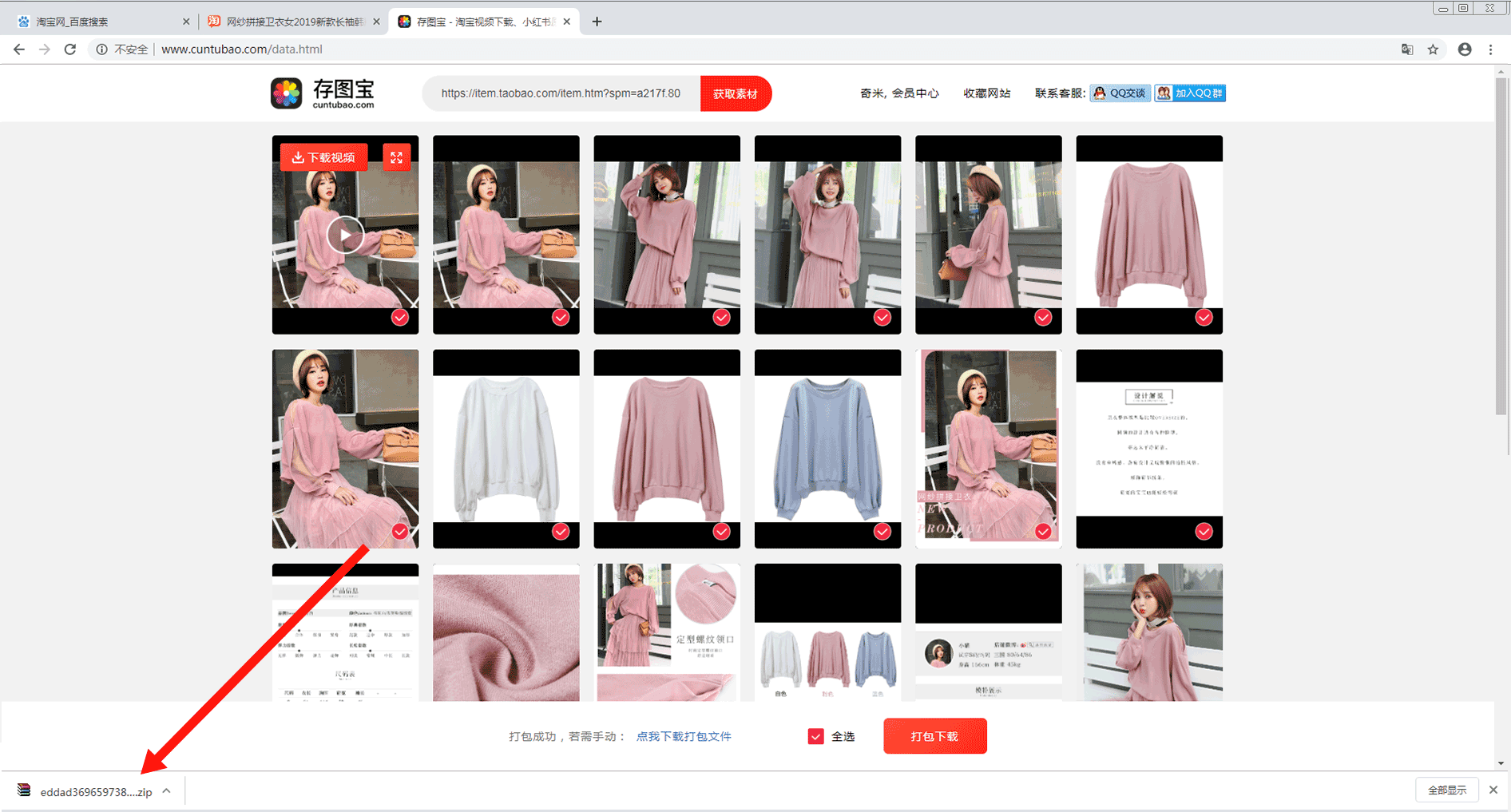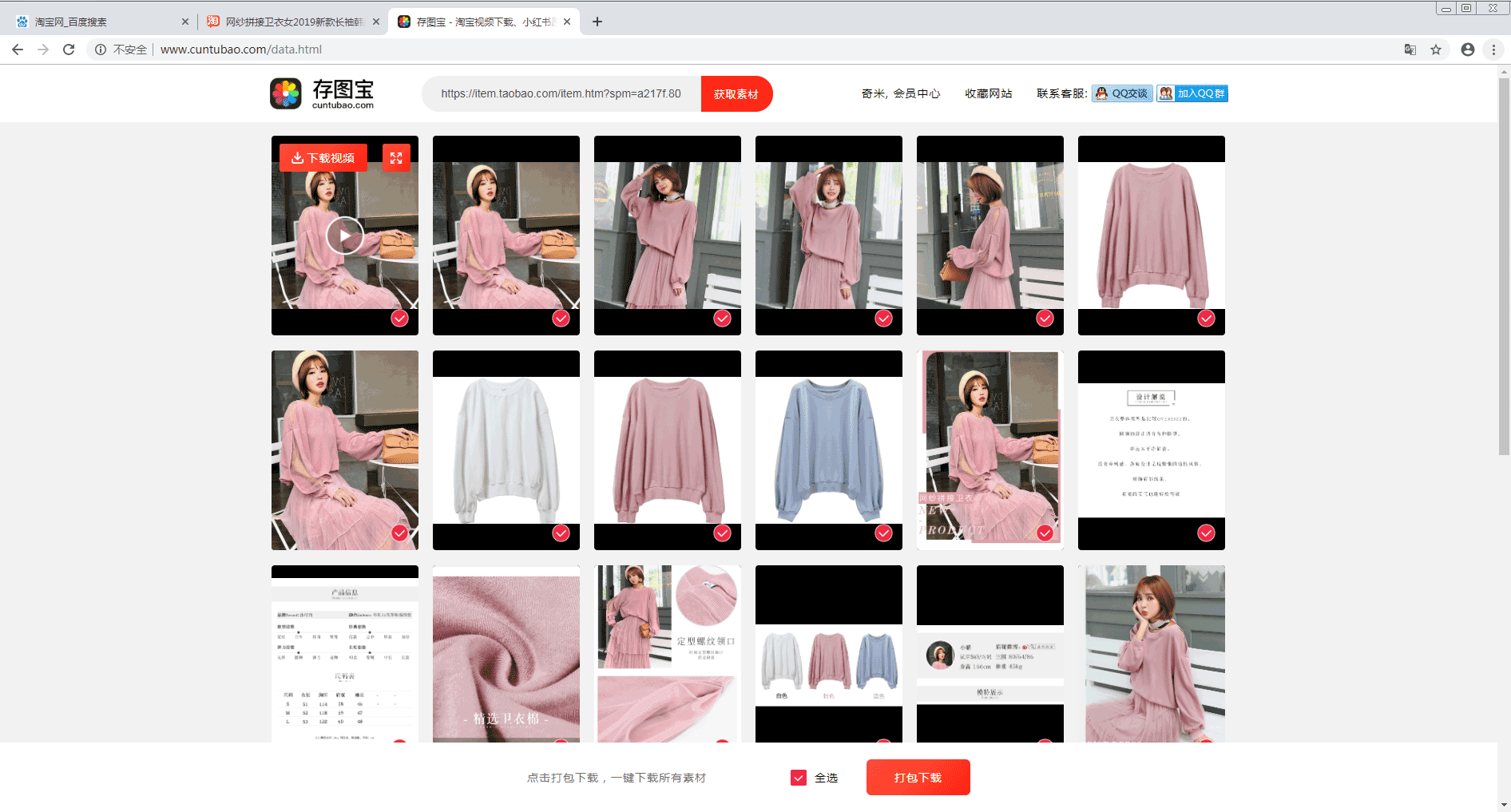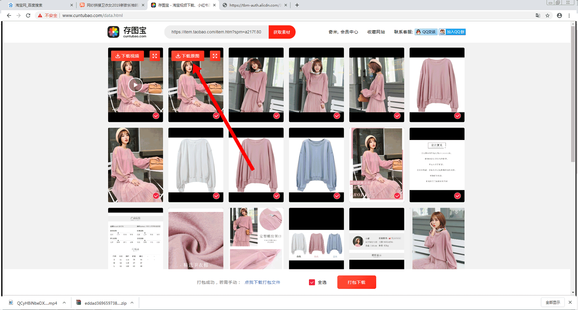 在该页面中,将会显示出该链接中所有能够下载的视频和图片。我们可通过点击“打包下载”按钮,对所需要的视频和图片进行打包下载。
