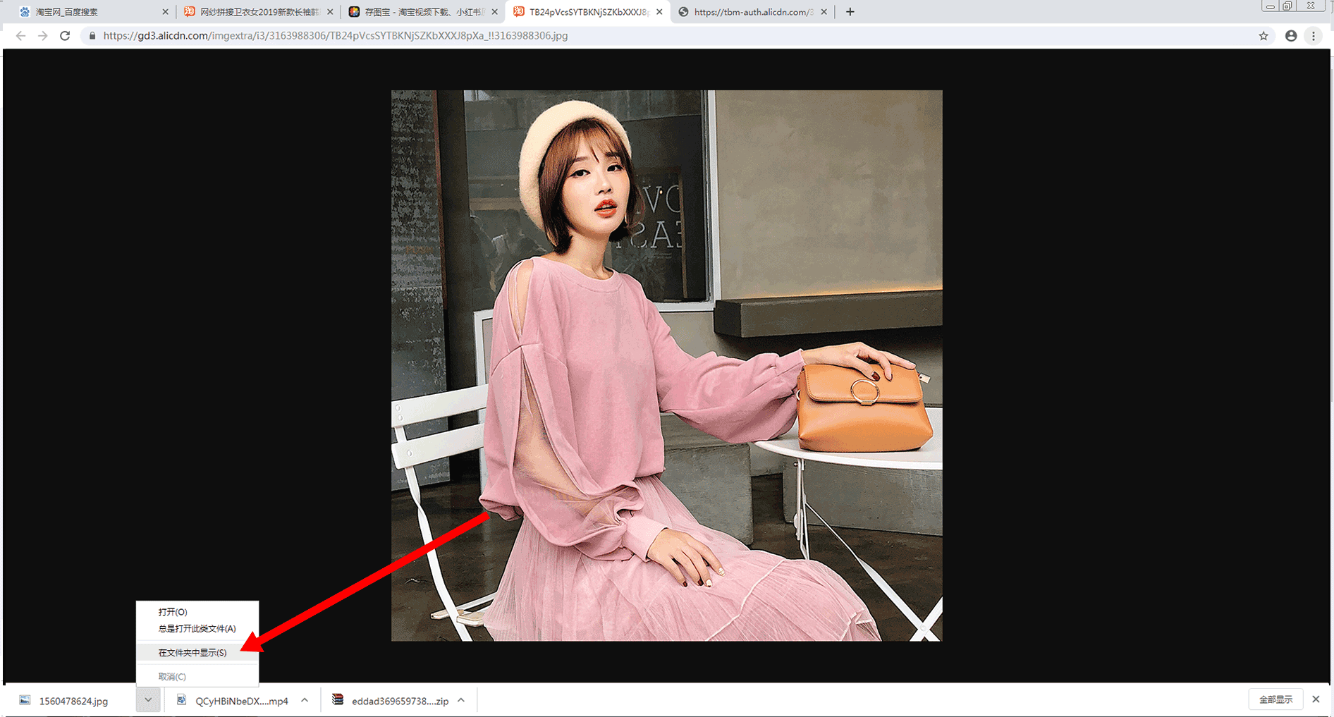 如果无法记住所下载图片的保存路径,可点击左下角图片文件右侧的箭头,然后再点击“在文件夹中显示(S)”列表,如下图所示: